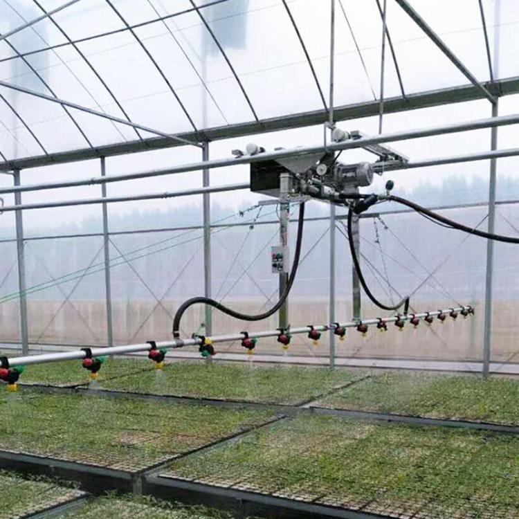 溫室自動噴灌機(jī)為普通型雙臂自走式噴灌機(jī),噴灌的均勻度高,噴嘴的狀況可根據(jù)使用目的進(jìn)行調(diào)整,除常規(guī)灌溉外還可進(jìn)行施肥和試藥等多種作業(yè)工作。